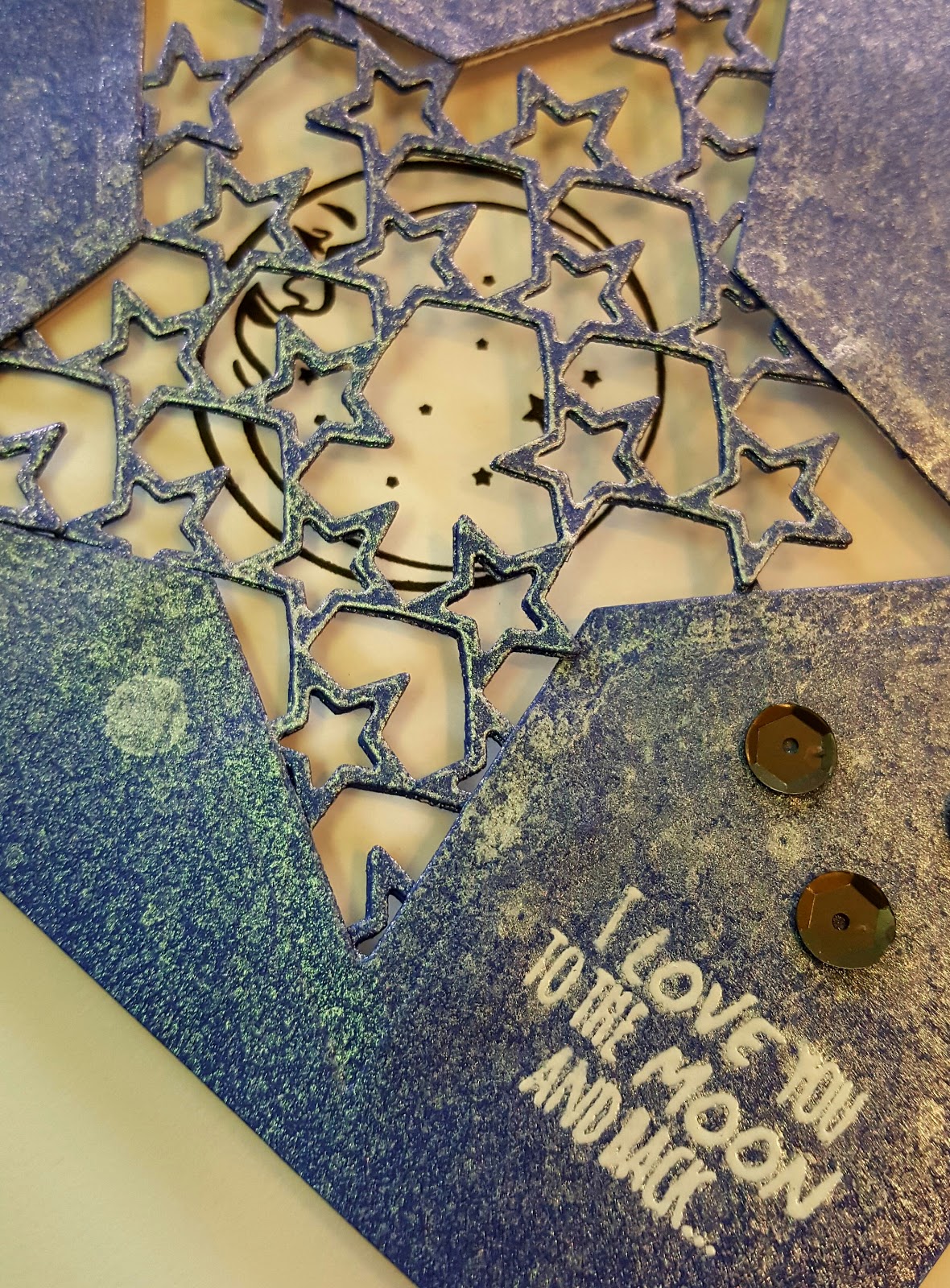 As you can see, I wedged the smaller stars between two pieces of card stock die cut with a larger star. On the top panel I used MFT Mixable Mist Sheer Shimmer to achieve a shimmery glow. It's hard to see in this pic! The moon stamp and sentiment are from Brutus Monroe, and the sequins are from Mint Owl Studio, Cloudy Day mix. The small stars are a new die from Simon Says Stamp called Stacked Stars, and the large star is from Sizzix.