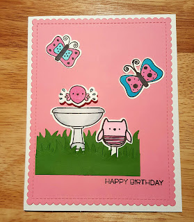 Wednesday Challenge "Think Pink." I used MFT "Things With Wings" stamps and dies and DieNamics Grass Die on a pink panel cut with Blueprint #27. The images were colored with copic markers.
