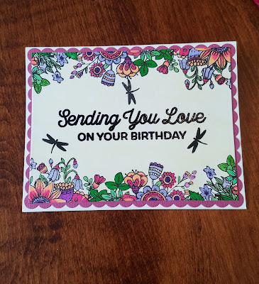 The card below uses a Honey Bee floral border stamp, colored with copic markers and some dragonflies from Technique Tuesday. The sentiment is from MFT. This card is for Simon Says Stamp Monday Challege "Things with Wings."